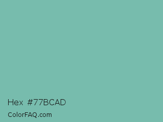 Hex #77bcad Color is a normal cyan color and the nearest color is Gulf Stream #80b3ae. Hex code #77bcad and RGB value is rgb(119,188,173). In RGB color space, this color is composed of 47% red, 74% green, 68% blue, In CMYK color space, this color is composed of 37% cyan, 0% magenta, 8% yellow , 26% black , In HSL color space, this color has a hue angle of 167° , 34% saturation and 60% lightness.