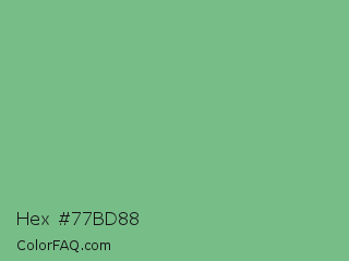 Hex #77bd88 Color is a normal green color and the nearest color is De York #7ac488. Hex code #77bd88 and RGB value is rgb(119,189,136). In RGB color space, this color is composed of 47% red, 74% green, 53% blue, In CMYK color space, this color is composed of 37% cyan, 0% magenta, 28% yellow , 26% black , In HSL color space, this color has a hue angle of 135° , 35% saturation and 60% lightness.