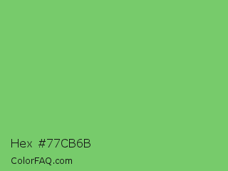 Hex #77cb6b Color is a light green color and the nearest color is Mantis #74c365. Hex code #77cb6b and RGB value is rgb(119,203,107). In RGB color space, this color is composed of 47% red, 80% green, 42% blue, In CMYK color space, this color is composed of 41% cyan, 0% magenta, 47% yellow , 20% black , In HSL color space, this color has a hue angle of 113° , 48% saturation and 61% lightness.