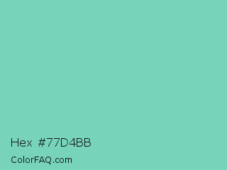 Hex #77d4bb Color is a light cyan color and the nearest color is Bermuda #7dd8c6. Hex code #77d4bb and RGB value is rgb(119,212,187). In RGB color space, this color is composed of 47% red, 83% green, 73% blue, In CMYK color space, this color is composed of 44% cyan, 0% magenta, 12% yellow , 17% black , In HSL color space, this color has a hue angle of 164° , 52% saturation and 65% lightness.