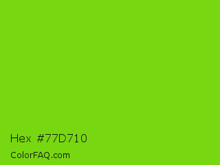 Hex #77d710 Color is a normal green color and the nearest color is Alien Armpit #84de02. Hex code #77d710 and RGB value is rgb(119,215,16). In RGB color space, this color is composed of 47% red, 84% green, 6% blue, In CMYK color space, this color is composed of 45% cyan, 0% magenta, 93% yellow , 16% black , In HSL color space, this color has a hue angle of 89° , 86% saturation and 45% lightness.
