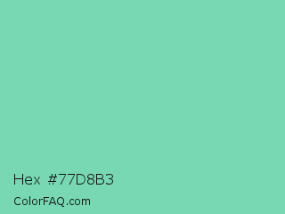 Hex #77d8b3 Color is a light green color and the nearest color is Medium Aquamarine #66ddaa. Hex code #77d8b3 and RGB value is rgb(119,216,179). In RGB color space, this color is composed of 47% red, 85% green, 70% blue, In CMYK color space, this color is composed of 45% cyan, 0% magenta, 17% yellow , 15% black , In HSL color space, this color has a hue angle of 157° , 55% saturation and 66% lightness.