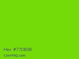 Hex #77db0b Color is a normal green color and the nearest color is Alien Armpit #84de02. Hex code #77db0b and RGB value is rgb(119,219,11). In RGB color space, this color is composed of 47% red, 86% green, 4% blue, In CMYK color space, this color is composed of 46% cyan, 0% magenta, 95% yellow , 14% black , In HSL color space, this color has a hue angle of 89° , 90% saturation and 45% lightness.