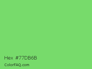 Hex #77db6b Color is a light green color and the nearest color is Pastel Green #77dd77. Hex code #77db6b and RGB value is rgb(119,219,107). In RGB color space, this color is composed of 47% red, 86% green, 42% blue, In CMYK color space, this color is composed of 46% cyan, 0% magenta, 51% yellow , 14% black , In HSL color space, this color has a hue angle of 114° , 61% saturation and 64% lightness.