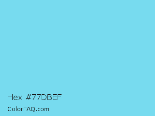 Hex #77dbef Color is a light cyan color and the nearest color is Spray #79deec. Hex code #77dbef and RGB value is rgb(119,219,239). In RGB color space, this color is composed of 47% red, 86% green, 94% blue, In CMYK color space, this color is composed of 50% cyan, 8% magenta, 0% yellow , 6% black , In HSL color space, this color has a hue angle of 190° , 79% saturation and 70% lightness.