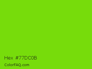 Hex #77dc0b Color is a normal green color and the nearest color is Alien Armpit #84de02. Hex code #77dc0b and RGB value is rgb(119,220,11). In RGB color space, this color is composed of 47% red, 86% green, 4% blue, In CMYK color space, this color is composed of 46% cyan, 0% magenta, 95% yellow , 14% black , In HSL color space, this color has a hue angle of 89° , 90% saturation and 45% lightness.