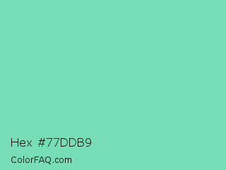 Hex #77ddb9 Color is a light green color and the nearest color is Bermuda #7dd8c6. Hex code #77ddb9 and RGB value is rgb(119,221,185). In RGB color space, this color is composed of 47% red, 87% green, 73% blue, In CMYK color space, this color is composed of 46% cyan, 0% magenta, 16% yellow , 13% black , In HSL color space, this color has a hue angle of 159° , 60% saturation and 67% lightness.