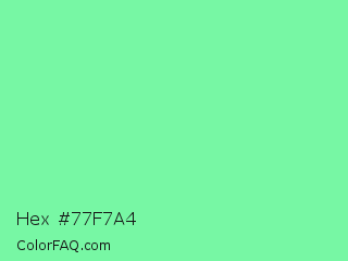 Hex #77f7a4 Color is a light green color and the nearest color is Medium Aquamarine #66ddaa. Hex code #77f7a4 and RGB value is rgb(119,247,164). In RGB color space, this color is composed of 47% red, 97% green, 64% blue, In CMYK color space, this color is composed of 52% cyan, 0% magenta, 34% yellow , 3% black , In HSL color space, this color has a hue angle of 141° , 89% saturation and 72% lightness.