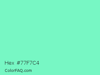 Hex #77f7c4 Color is a light green color and the nearest color is Aquamarine #7fffd4. Hex code #77f7c4 and RGB value is rgb(119,247,196). In RGB color space, this color is composed of 47% red, 97% green, 77% blue, In CMYK color space, this color is composed of 52% cyan, 0% magenta, 21% yellow , 3% black , In HSL color space, this color has a hue angle of 156° , 89% saturation and 72% lightness.