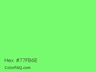 Hex #77fb6e Color is a light green color and the nearest color is Screamin Green #66ff66. Hex code #77fb6e and RGB value is rgb(119,251,110). In RGB color space, this color is composed of 47% red, 98% green, 43% blue, In CMYK color space, this color is composed of 53% cyan, 0% magenta, 56% yellow , 2% black , In HSL color space, this color has a hue angle of 116° , 95% saturation and 71% lightness.