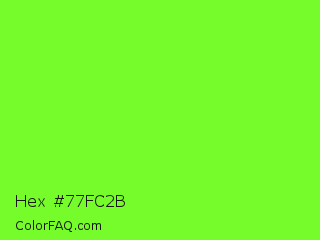 Hex #77fc2b Color is a normal green color and the nearest color is Spring Frost #87ff2a. Hex code #77fc2b and RGB value is rgb(119,252,43). In RGB color space, this color is composed of 47% red, 99% green, 17% blue, In CMYK color space, this color is composed of 53% cyan, 0% magenta, 83% yellow , 1% black , In HSL color space, this color has a hue angle of 98° , 97% saturation and 58% lightness.