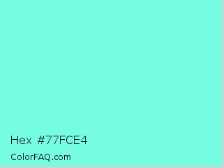 Hex #77fce4 Color is a light cyan color and the nearest color is Aquamarine #7fffd4. Hex code #77fce4 and RGB value is rgb(119,252,228). In RGB color space, this color is composed of 47% red, 99% green, 89% blue, In CMYK color space, this color is composed of 53% cyan, 0% magenta, 10% yellow , 1% black , In HSL color space, this color has a hue angle of 169° , 96% saturation and 73% lightness.