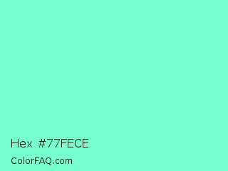 Hex #77fece Color is a light green color and the nearest color is Aquamarine #7fffd4. Hex code #77fece and RGB value is rgb(119,254,206). In RGB color space, this color is composed of 47% red, 100% green, 81% blue, In CMYK color space, this color is composed of 53% cyan, 0% magenta, 19% yellow , 0% black , In HSL color space, this color has a hue angle of 159° , 99% saturation and 73% lightness.