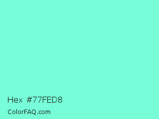 Hex #77fed8 Color is a light green color and the nearest color is Aquamarine #7fffd4. Hex code #77fed8 and RGB value is rgb(119,254,216). In RGB color space, this color is composed of 47% red, 100% green, 85% blue, In CMYK color space, this color is composed of 53% cyan, 0% magenta, 15% yellow , 0% black , In HSL color space, this color has a hue angle of 163° , 99% saturation and 73% lightness.