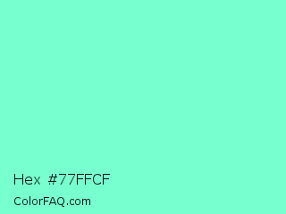 Hex #77ffcf Color is a light green color and the nearest color is Aquamarine #7fffd4. Hex code #77ffcf and RGB value is rgb(119,255,207). In RGB color space, this color is composed of 47% red, 100% green, 81% blue, In CMYK color space, this color is composed of 53% cyan, 0% magenta, 19% yellow , 0% black , In HSL color space, this color has a hue angle of 159° , 100% saturation and 73% lightness.