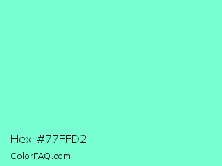 Hex #77ffd2 Color is a light green color and the nearest color is Aquamarine #7fffd4. Hex code #77ffd2 and RGB value is rgb(119,255,210). In RGB color space, this color is composed of 47% red, 100% green, 82% blue, In CMYK color space, this color is composed of 53% cyan, 0% magenta, 18% yellow , 0% black , In HSL color space, this color has a hue angle of 160° , 100% saturation and 73% lightness.