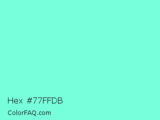 Hex #77ffdb Color is a light cyan color and the nearest color is Aquamarine #7fffd4. Hex code #77ffdb and RGB value is rgb(119,255,219). In RGB color space, this color is composed of 47% red, 100% green, 86% blue, In CMYK color space, this color is composed of 53% cyan, 0% magenta, 14% yellow , 0% black , In HSL color space, this color has a hue angle of 164° , 100% saturation and 73% lightness.