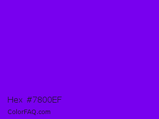 Hex #7800ef Color is a normal violet color and the nearest color is Violet Color Wheel #7f00ff. Hex code #7800ef and RGB value is rgb(120,0,239). In RGB color space, this color is composed of 47% red, 0% green, 94% blue, In CMYK color space, this color is composed of 50% cyan, 100% magenta, 0% yellow , 6% black , In HSL color space, this color has a hue angle of 270° , 100% saturation and 47% lightness.