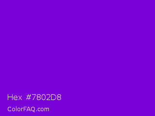 Hex #7802d8 Color is a normal purple color and the nearest color is French Violet #8806ce. Hex code #7802d8 and RGB value is rgb(120,2,216). In RGB color space, this color is composed of 47% red, 1% green, 85% blue, In CMYK color space, this color is composed of 44% cyan, 99% magenta, 0% yellow , 15% black , In HSL color space, this color has a hue angle of 273° , 98% saturation and 43% lightness.