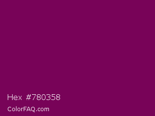 Hex #780358 Color is a dark magenta color and the nearest color is French Plum #811453. Hex code #780358 and RGB value is rgb(120,3,88). In RGB color space, this color is composed of 47% red, 1% green, 35% blue, In CMYK color space, this color is composed of 0% cyan, 98% magenta, 27% yellow , 53% black , In HSL color space, this color has a hue angle of 316° , 95% saturation and 24% lightness.
