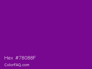 Hex #78088f Color is a dark purple color and the nearest color is Patriarch #800080. Hex code #78088f and RGB value is rgb(120,8,143). In RGB color space, this color is composed of 47% red, 3% green, 56% blue, In CMYK color space, this color is composed of 16% cyan, 94% magenta, 0% yellow , 44% black , In HSL color space, this color has a hue angle of 290° , 89% saturation and 30% lightness.