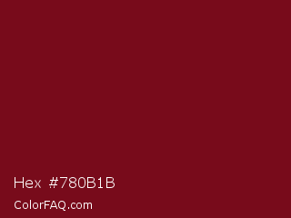 Hex #780b1b Color is a dark red color and the nearest color is UP Maroon #7b1113. Hex code #780b1b and RGB value is rgb(120,11,27). In RGB color space, this color is composed of 47% red, 4% green, 11% blue, In CMYK color space, this color is composed of 0% cyan, 91% magenta, 78% yellow , 53% black , In HSL color space, this color has a hue angle of 351° , 83% saturation and 26% lightness.
