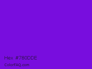 Hex #780dde Color is a normal purple color and the nearest color is French Violet #8806ce. Hex code #780dde and RGB value is rgb(120,13,222). In RGB color space, this color is composed of 47% red, 5% green, 87% blue, In CMYK color space, this color is composed of 46% cyan, 94% magenta, 0% yellow , 13% black , In HSL color space, this color has a hue angle of 271° , 89% saturation and 46% lightness.