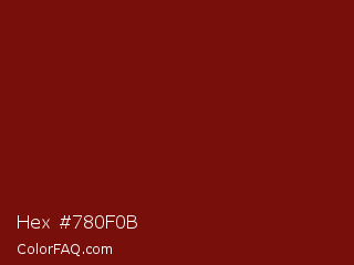 Hex #780f0b Color is a dark red color and the nearest color is Dark Burgundy #770f05. Hex code #780f0b and RGB value is rgb(120,15,11). In RGB color space, this color is composed of 47% red, 6% green, 4% blue, In CMYK color space, this color is composed of 0% cyan, 88% magenta, 91% yellow , 53% black , In HSL color space, this color has a hue angle of 2° , 83% saturation and 26% lightness.