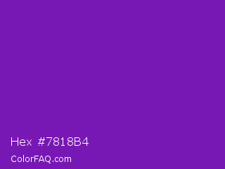 Hex #7818b4 Color is a normal purple color and the nearest color is Grape #6f2da8. Hex code #7818b4 and RGB value is rgb(120,24,180). In RGB color space, this color is composed of 47% red, 9% green, 71% blue, In CMYK color space, this color is composed of 33% cyan, 87% magenta, 0% yellow , 29% black , In HSL color space, this color has a hue angle of 277° , 76% saturation and 40% lightness.