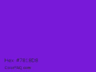 Hex #7818d8 Color is a normal violet color and the nearest color is French Violet #8806ce. Hex code #7818d8 and RGB value is rgb(120,24,216). In RGB color space, this color is composed of 47% red, 9% green, 85% blue, In CMYK color space, this color is composed of 44% cyan, 89% magenta, 0% yellow , 15% black , In HSL color space, this color has a hue angle of 270° , 80% saturation and 47% lightness.