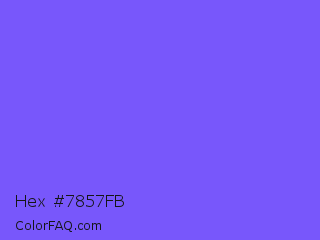 Hex #7857fb Color is a light indigo color and the nearest color is Medium Slate Blue #7b68ee. Hex code #7857fb and RGB value is rgb(120,87,251). In RGB color space, this color is composed of 47% red, 34% green, 98% blue, In CMYK color space, this color is composed of 52% cyan, 65% magenta, 0% yellow , 2% black , In HSL color space, this color has a hue angle of 252° , 95% saturation and 66% lightness.