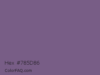 Hex #785d86 Color is a normal purple color and the nearest color is Rum #796989. Hex code #785d86 and RGB value is rgb(120,93,134). In RGB color space, this color is composed of 47% red, 36% green, 53% blue, In CMYK color space, this color is composed of 10% cyan, 31% magenta, 0% yellow , 47% black , In HSL color space, this color has a hue angle of 280° , 18% saturation and 45% lightness.