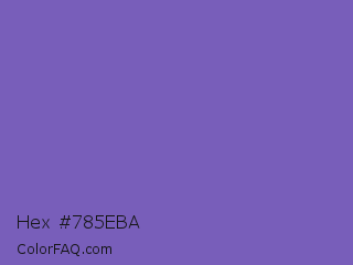 Hex #785eba Color is a normal indigo color and the nearest color is Fuchsia Blue #7a58c1. Hex code #785eba and RGB value is rgb(120,94,186). In RGB color space, this color is composed of 47% red, 37% green, 73% blue, In CMYK color space, this color is composed of 35% cyan, 49% magenta, 0% yellow , 27% black , In HSL color space, this color has a hue angle of 257° , 40% saturation and 55% lightness.
