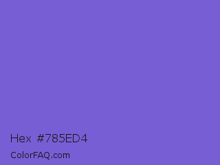 Hex #785ed4 Color is a normal indigo color and the nearest color is Slate Blue #6a5acd. Hex code #785ed4 and RGB value is rgb(120,94,212). In RGB color space, this color is composed of 47% red, 37% green, 83% blue, In CMYK color space, this color is composed of 43% cyan, 56% magenta, 0% yellow , 17% black , In HSL color space, this color has a hue angle of 253° , 58% saturation and 60% lightness.