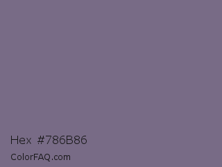 Hex #786b86 Color is a normal violet color and the nearest color is Rum #796989. Hex code #786b86 and RGB value is rgb(120,107,134). In RGB color space, this color is composed of 47% red, 42% green, 53% blue, In CMYK color space, this color is composed of 10% cyan, 20% magenta, 0% yellow , 47% black , In HSL color space, this color has a hue angle of 269° , 11% saturation and 47% lightness.