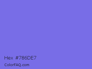Hex #786de7 Color is a light indigo color and the nearest color is Medium Slate Blue #7b68ee. Hex code #786de7 and RGB value is rgb(120,109,231). In RGB color space, this color is composed of 47% red, 43% green, 91% blue, In CMYK color space, this color is composed of 48% cyan, 53% magenta, 0% yellow , 9% black , In HSL color space, this color has a hue angle of 245° , 72% saturation and 67% lightness.