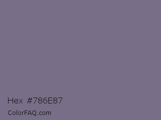 Hex #786e87 Color is a normal violet color and the nearest color is Rum #796989. Hex code #786e87 and RGB value is rgb(120,110,135). In RGB color space, this color is composed of 47% red, 43% green, 53% blue, In CMYK color space, this color is composed of 11% cyan, 19% magenta, 0% yellow , 47% black , In HSL color space, this color has a hue angle of 264° , 10% saturation and 48% lightness.