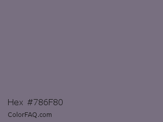 Hex #786f80 Color is a normal purple color and the nearest color is Fedora #796a78. Hex code #786f80 and RGB value is rgb(120,111,128). In RGB color space, this color is composed of 47% red, 44% green, 50% blue, In CMYK color space, this color is composed of 6% cyan, 13% magenta, 0% yellow , 50% black , In HSL color space, this color has a hue angle of 272° , 7% saturation and 47% lightness.