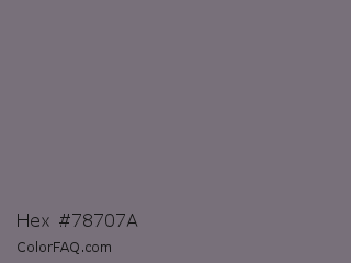 Hex #78707a Color is a normal purple color and the nearest color is Fedora #796a78. Hex code #78707a and RGB value is rgb(120,112,122). In RGB color space, this color is composed of 47% red, 44% green, 48% blue, In CMYK color space, this color is composed of 2% cyan, 8% magenta, 0% yellow , 52% black , In HSL color space, this color has a hue angle of 288° , 4% saturation and 46% lightness.