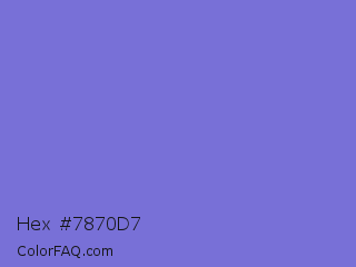 Hex #7870d7 Color is a light indigo color and the nearest color is Moody Blue #7f76d3. Hex code #7870d7 and RGB value is rgb(120,112,215). In RGB color space, this color is composed of 47% red, 44% green, 84% blue, In CMYK color space, this color is composed of 44% cyan, 48% magenta, 0% yellow , 16% black , In HSL color space, this color has a hue angle of 245° , 56% saturation and 64% lightness.