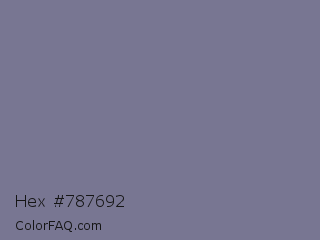 Hex #787692 Color is a normal indigo color and the nearest color is Rhythm #777696. Hex code #787692 and RGB value is rgb(120,118,146). In RGB color space, this color is composed of 47% red, 46% green, 57% blue, In CMYK color space, this color is composed of 18% cyan, 19% magenta, 0% yellow , 43% black , In HSL color space, this color has a hue angle of 244° , 11% saturation and 52% lightness.