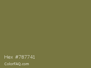 Hex #787741 Color is a normal yellow color and the nearest color is Pesto #7c7631. Hex code #787741 and RGB value is rgb(120,119,65). In RGB color space, this color is composed of 47% red, 47% green, 25% blue, In CMYK color space, this color is composed of 0% cyan, 1% magenta, 46% yellow , 53% black , In HSL color space, this color has a hue angle of 59° , 30% saturation and 36% lightness.