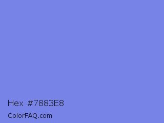 Hex #7883e8 Color is a light blue color and the nearest color is Chetwode Blue #8581d9. Hex code #7883e8 and RGB value is rgb(120,131,232). In RGB color space, this color is composed of 47% red, 51% green, 91% blue, In CMYK color space, this color is composed of 48% cyan, 44% magenta, 0% yellow , 9% black , In HSL color space, this color has a hue angle of 234° , 71% saturation and 69% lightness.