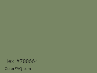 Hex #788664 Color is a normal green color and the nearest color is Flax Smoke #7b8265. Hex code #788664 and RGB value is rgb(120,134,100). In RGB color space, this color is composed of 47% red, 53% green, 39% blue, In CMYK color space, this color is composed of 10% cyan, 0% magenta, 25% yellow , 47% black , In HSL color space, this color has a hue angle of 85° , 15% saturation and 46% lightness.