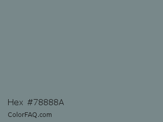Hex #78888a Color is a normal cyan color and the nearest color is Blue Smoke #748881. Hex code #78888a and RGB value is rgb(120,136,138). In RGB color space, this color is composed of 47% red, 53% green, 54% blue, In CMYK color space, this color is composed of 13% cyan, 1% magenta, 0% yellow , 46% black , In HSL color space, this color has a hue angle of 187° , 7% saturation and 51% lightness.