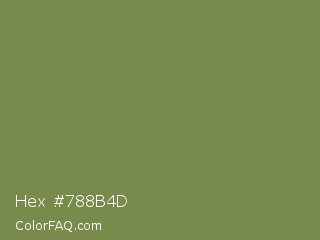 Hex #788b4d Color is a normal lime color and the nearest color is Palm Leaf #6f9940. Hex code #788b4d and RGB value is rgb(120,139,77). In RGB color space, this color is composed of 47% red, 55% green, 30% blue, In CMYK color space, this color is composed of 14% cyan, 0% magenta, 45% yellow , 45% black , In HSL color space, this color has a hue angle of 78° , 29% saturation and 42% lightness.