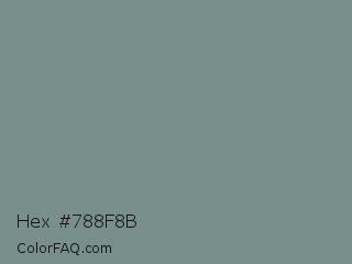 Hex #788f8b Color is a normal cyan color and the nearest color is Dolphin Gray #828e84. Hex code #788f8b and RGB value is rgb(120,143,139). In RGB color space, this color is composed of 47% red, 56% green, 55% blue, In CMYK color space, this color is composed of 16% cyan, 0% magenta, 3% yellow , 44% black , In HSL color space, this color has a hue angle of 170° , 9% saturation and 52% lightness.