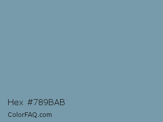 Hex #789bab Color is a normal blue color and the nearest color is Weldon Blue #7c98ab. Hex code #789bab and RGB value is rgb(120,155,171). In RGB color space, this color is composed of 47% red, 61% green, 67% blue, In CMYK color space, this color is composed of 30% cyan, 9% magenta, 0% yellow , 33% black , In HSL color space, this color has a hue angle of 199° , 23% saturation and 57% lightness.