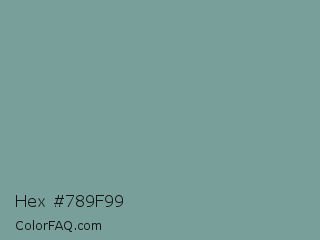 Hex #789f99 Color is a normal cyan color and the nearest color is Sea Nymph #78a39c. Hex code #789f99 and RGB value is rgb(120,159,153). In RGB color space, this color is composed of 47% red, 62% green, 60% blue, In CMYK color space, this color is composed of 25% cyan, 0% magenta, 4% yellow , 38% black , In HSL color space, this color has a hue angle of 171° , 17% saturation and 55% lightness.