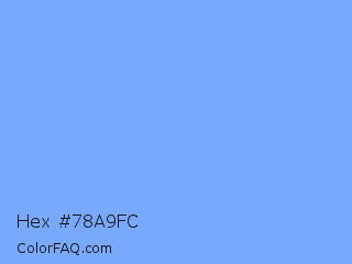 Hex #78a9fc Color is a light blue color and the nearest color is French Sky Blue #77b5fe. Hex code #78a9fc and RGB value is rgb(120,169,252). In RGB color space, this color is composed of 47% red, 66% green, 99% blue, In CMYK color space, this color is composed of 52% cyan, 33% magenta, 0% yellow , 1% black , In HSL color space, this color has a hue angle of 218° , 96% saturation and 73% lightness.